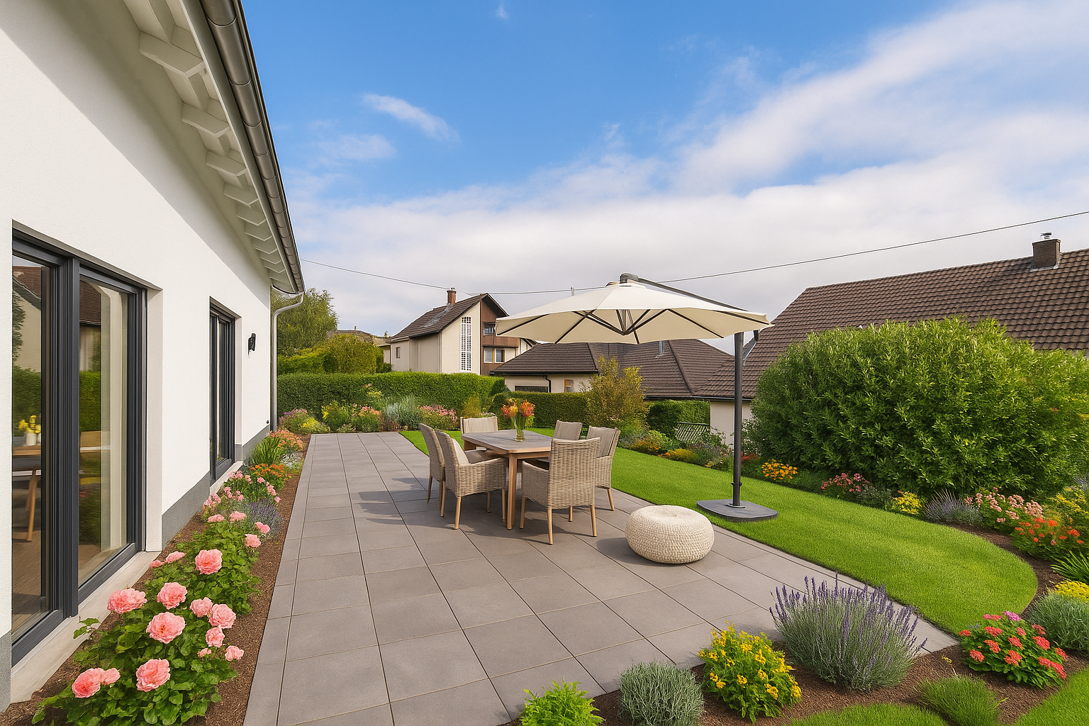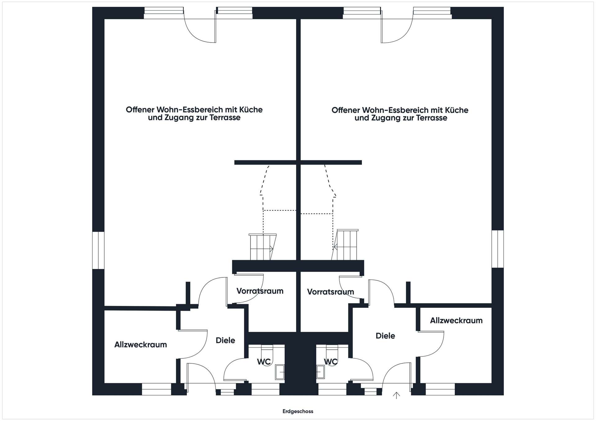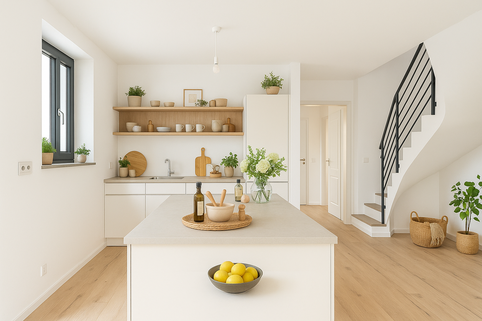 Der offene Wohn- und Essbereich im Erdgeschoss bildet den Mittelpunkt des Hauses. Große Fensterflächen sorgen für viel Tageslicht und schaffen eine natürliche Verbindung zur Terrasse und in den Garten. Die Küche fügt sich harmonisch in den Raum ein und bietet die Möglichkeit, gemeinsames Kochen und Wohnen selbstverständlich miteinander zu verbinden. Ergänzt wird das Erdgeschoss durch einen Hauswirtschaftsraum, ein Gäste-WC und einen praktischen Abstellraum.