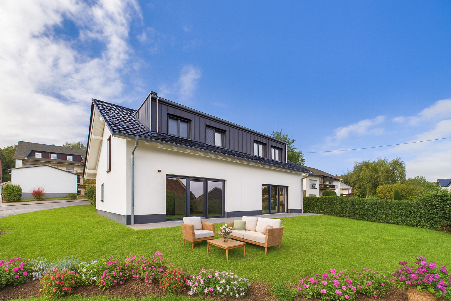 Diese Doppelhaushälfte eignet sich sowohl für Familien, Paare oder Menschen, die sich ein modernes Zuhause mit Ruhe, Licht und Platz wünschen, als auch für eine Nutzung zur Vermietung oder als Feriendomizil.