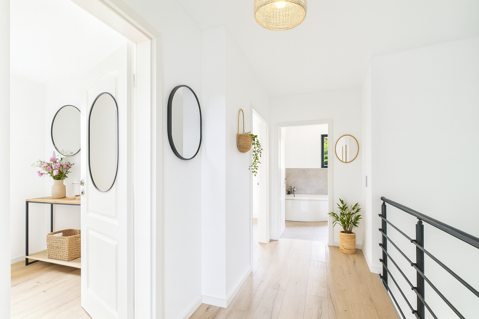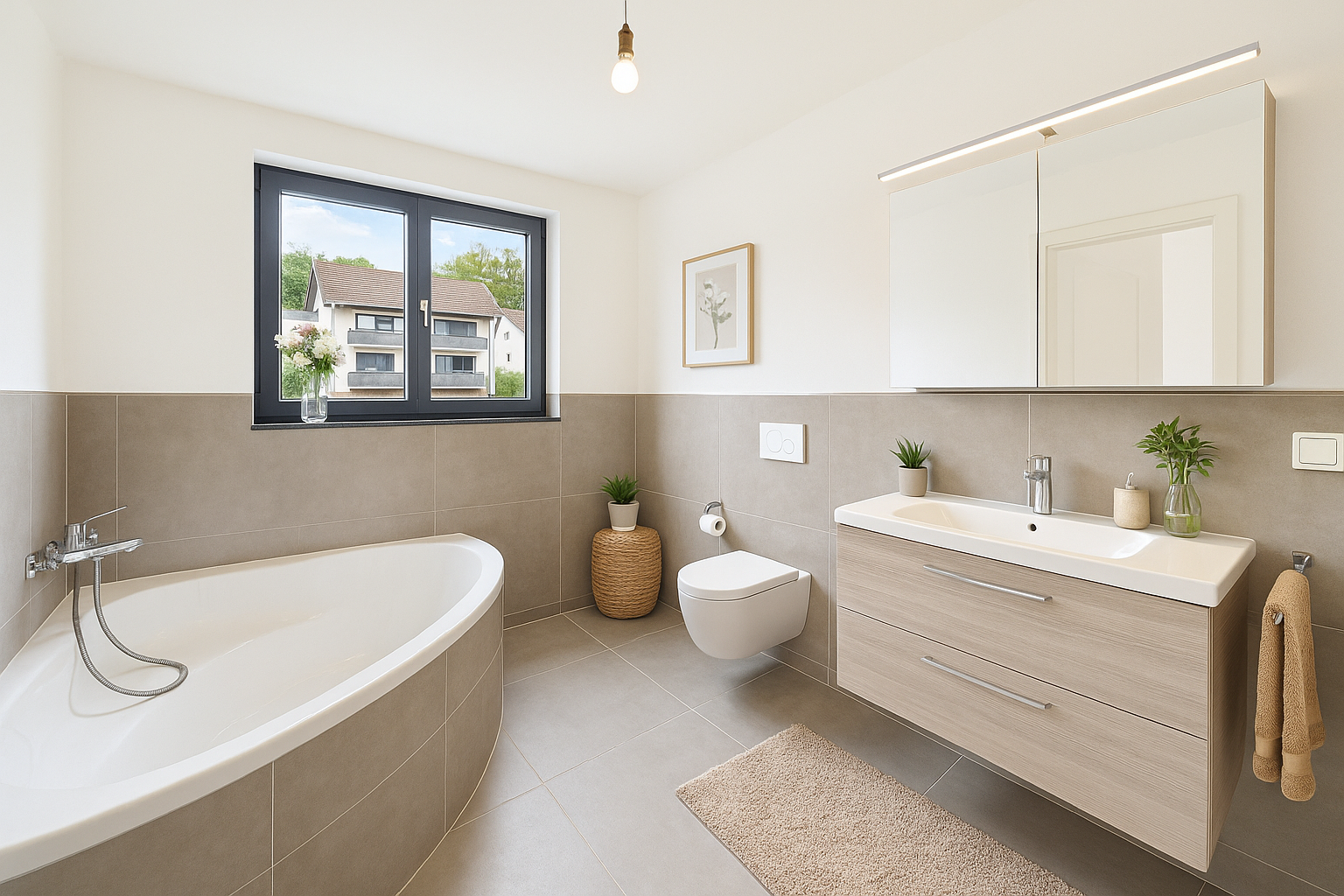 Im Obergeschoss erwarten Sie drei helle Schlafzimmer und ein modernes Tageslichtbad mit Dusche und Badewanne – ideal für Familien oder Gäste. Großzügige Fensterflächen sorgen für eine freundliche Atmosphäre und ein harmonisches Wohngefühl.