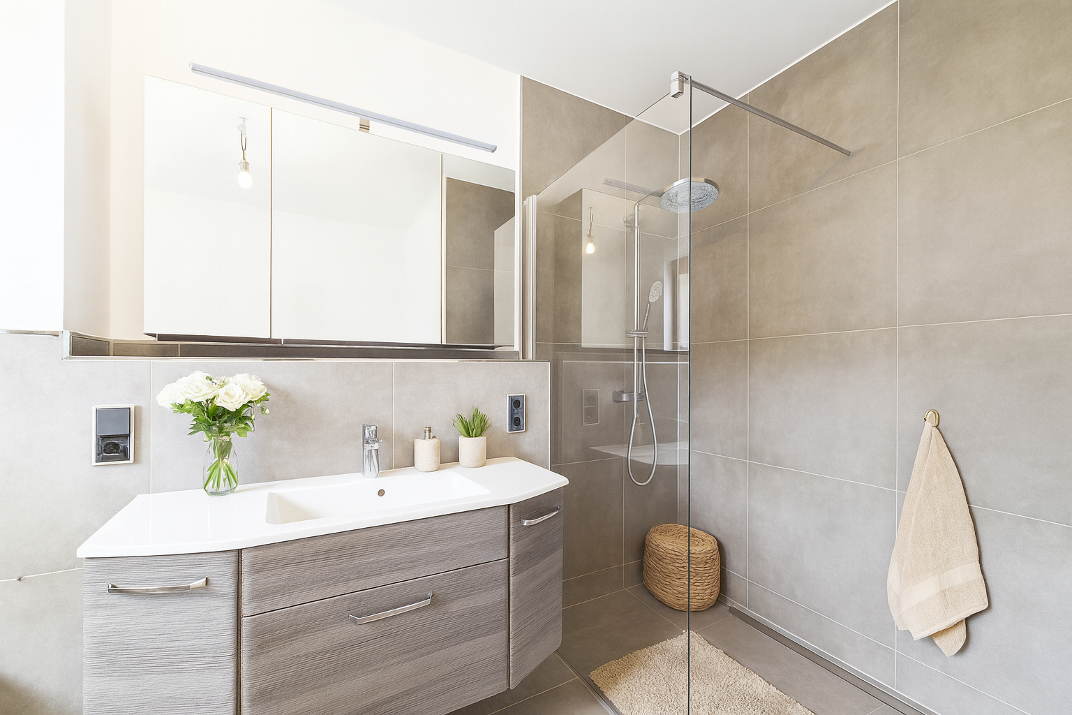 Der großzügige Wohn- und Essbereich mit offener Küche bildet das Herzstück des Hauses – lichtdurchflutet, offen gestaltet und mit direktem Zugang zur Terrasse und in den Garten. Hier entstehen Orte des Zusammenkommens und Wohlfühlmomente für jede Lebenssituation. Ergänzt wird das Erdgeschoss durch ein Gäste-WC, einen praktischen Hauswirtschaftsraum sowie einen Abstellraum mit viel Stauraum.