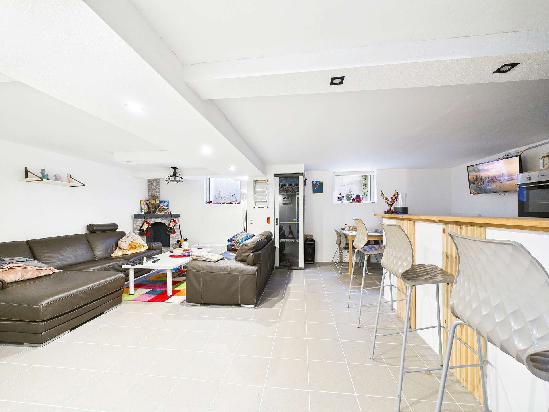 Das Untergeschoss bietet zusätzlich ca. 100 m² Nutzfläche. Ein Hobbyraum mit Küchenzeile, ein Badezimmer mit Dusche, der Heizungsraum sowie zwei Lagerräume schaffen ideale Voraussetzungen für kreative Nutzung, Stauraum oder erweiterte Wohnmöglichkeiten.
