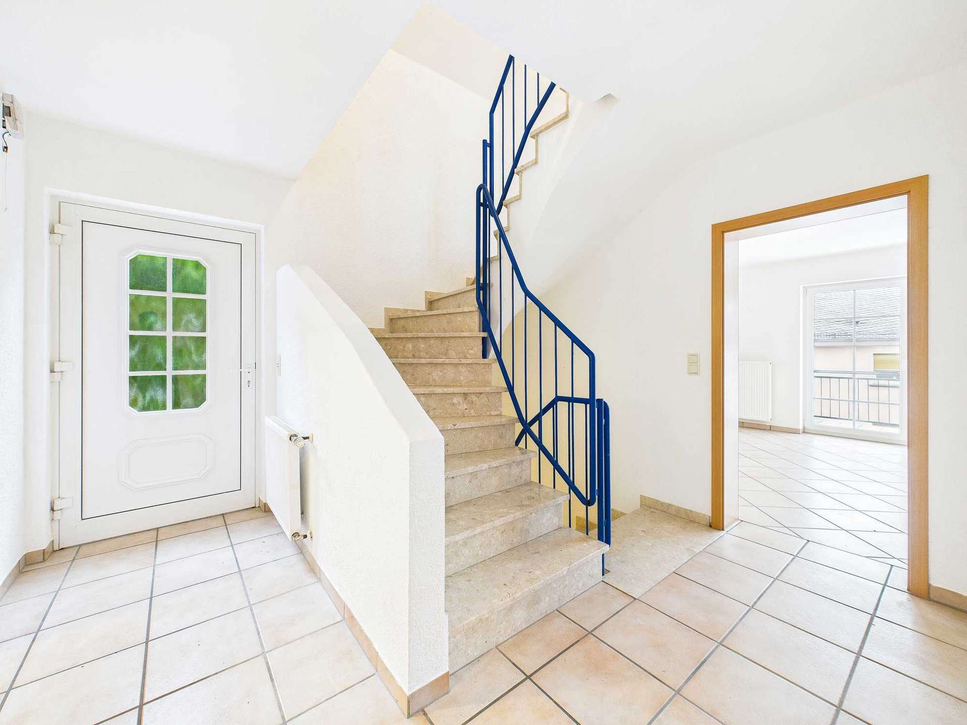 Aufgrund der topografischen Situation ist das Erdgeschoss über einige Treppenstufen erreichbar. Die Hauptwohnung erstreckt sich über das Erd- und Dachgeschoss und überzeugt durch eine durchdachte Raumaufteilung sowie helle, freundliche Wohnbereiche. Im Erdgeschoss bildet der offen gestaltete Wohn- und Essbereich das Zentrum des Hauses. Große Fensterflächen sorgen für eine angenehme Belichtung und ermöglichen den Zugang zum Balkon mit Moselblick. Die Küche befindet sich in einem separaten Raum und bietet ebenfalls Zugang zur Terrasse und zum rückwärtig gelegenen Garten. Die Terrasse ist dank der natürlichen Einfriedung nicht einsehbar. Dieser Bereich ist zusätzlich über eine Außentreppe neben dem Haus erreichbar. Ein Abstellraum sowie ein Gäste-WC ergänzen das Raumangebot auf dieser Ebene sinnvoll.