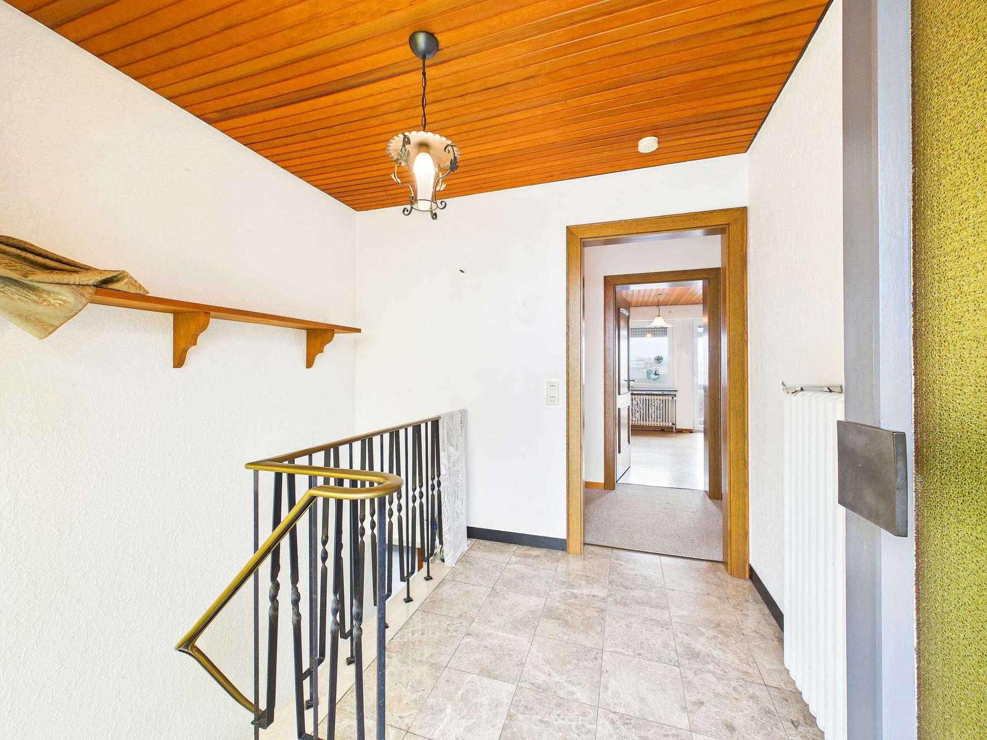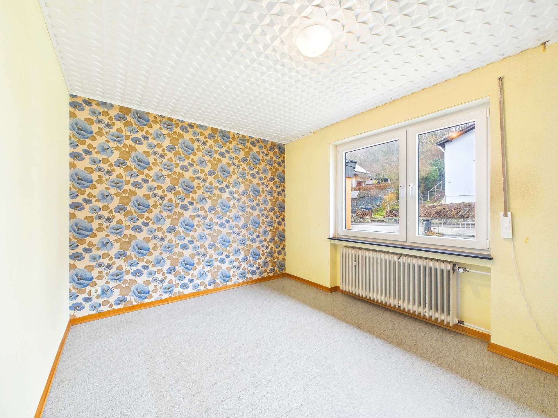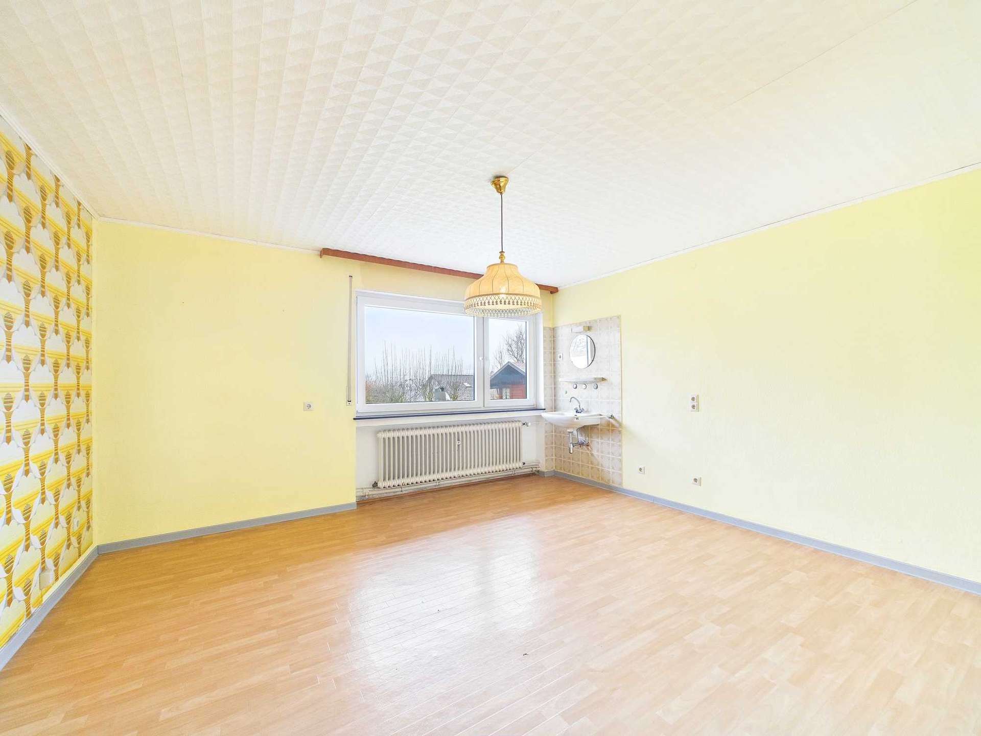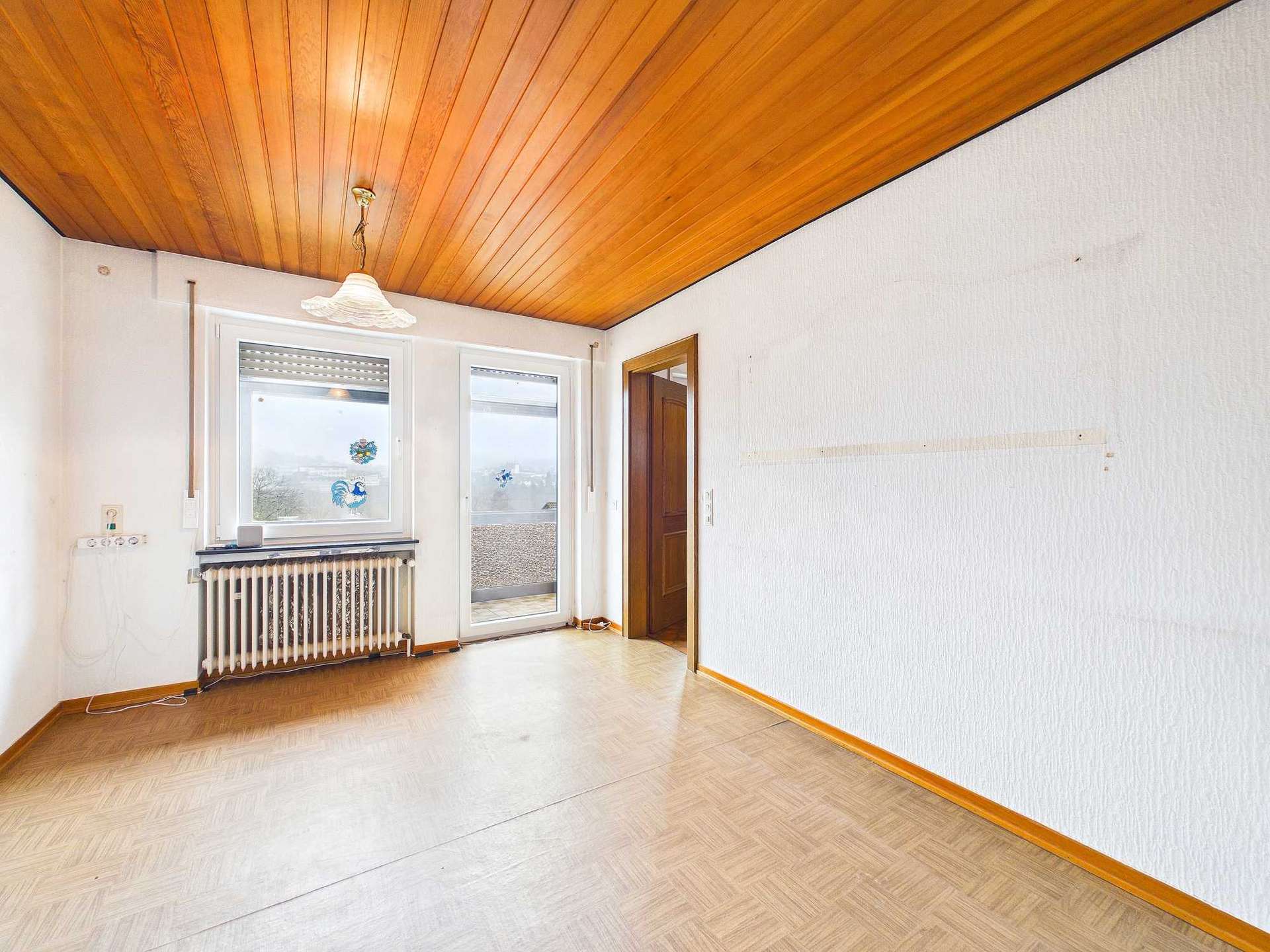 Die Immobilie bietet rund 135 m² Wohnfläche, verteilt auf sieben Zimmer, eine Küche sowie zwei Badezimmer. Im Erdgeschoss befindet sich das großzügige Wohnzimmer mit direktem Zugang zum überdachten Balkon. Von hier aus eröffnet sich der schönste Blick über Daun und die umliegende Umgebung. Auch das angrenzende Esszimmer verfügt über einen Zugang zum Balkon. Durch das Entfernen der Zwischenwand zwischen Küche und Esszimmer ließe sich ein moderner, großzügiger Küchen- und Essbereich realisieren, der heutigen Wohnansprüchen entspricht. Ergänzt wird diese Etage durch das Elternschlafzimmer sowie ein weiteres Zimmer, das flexibel als Kinder-, Arbeits- oder Gästezimmer genutzt werden kann.