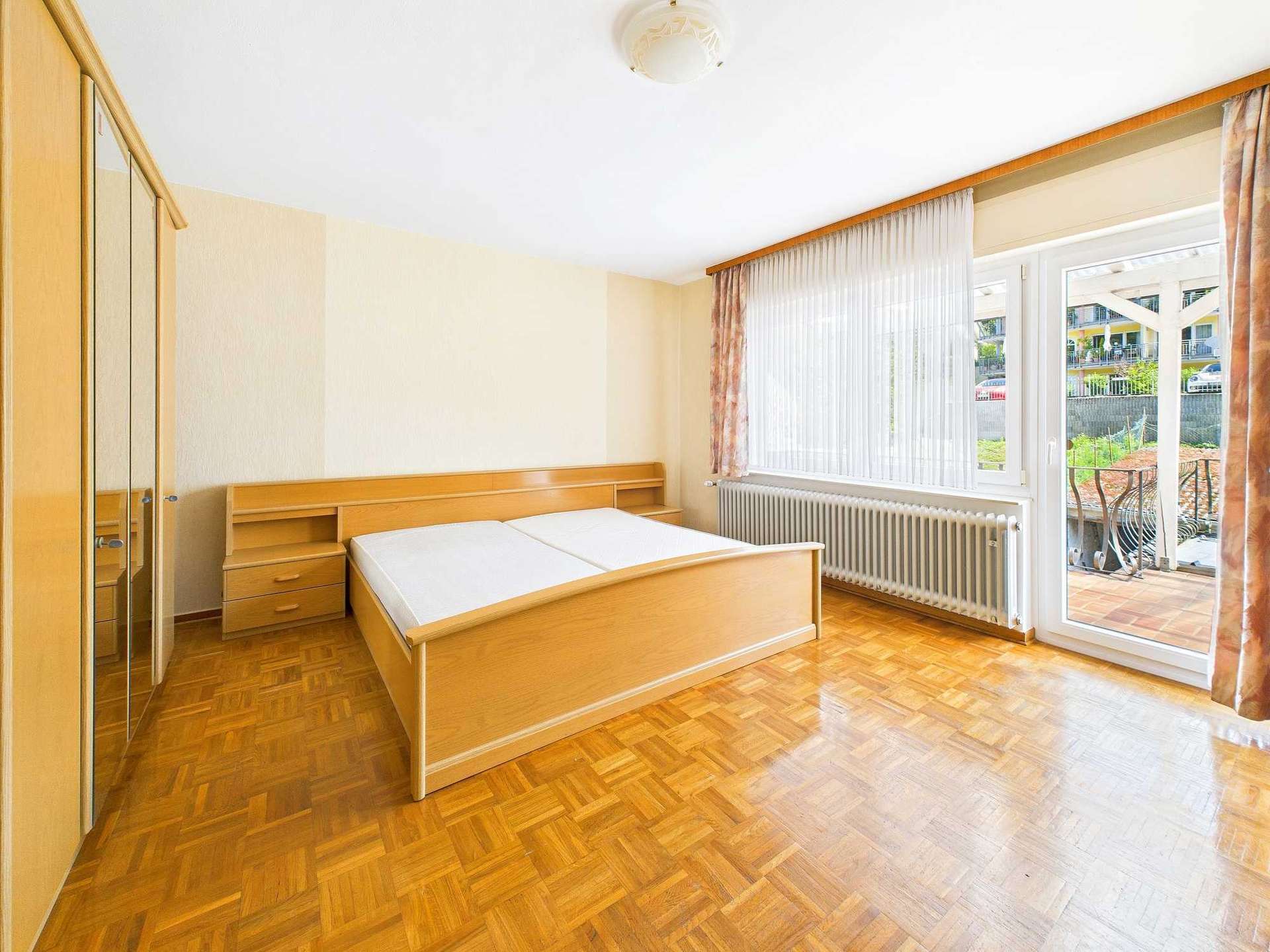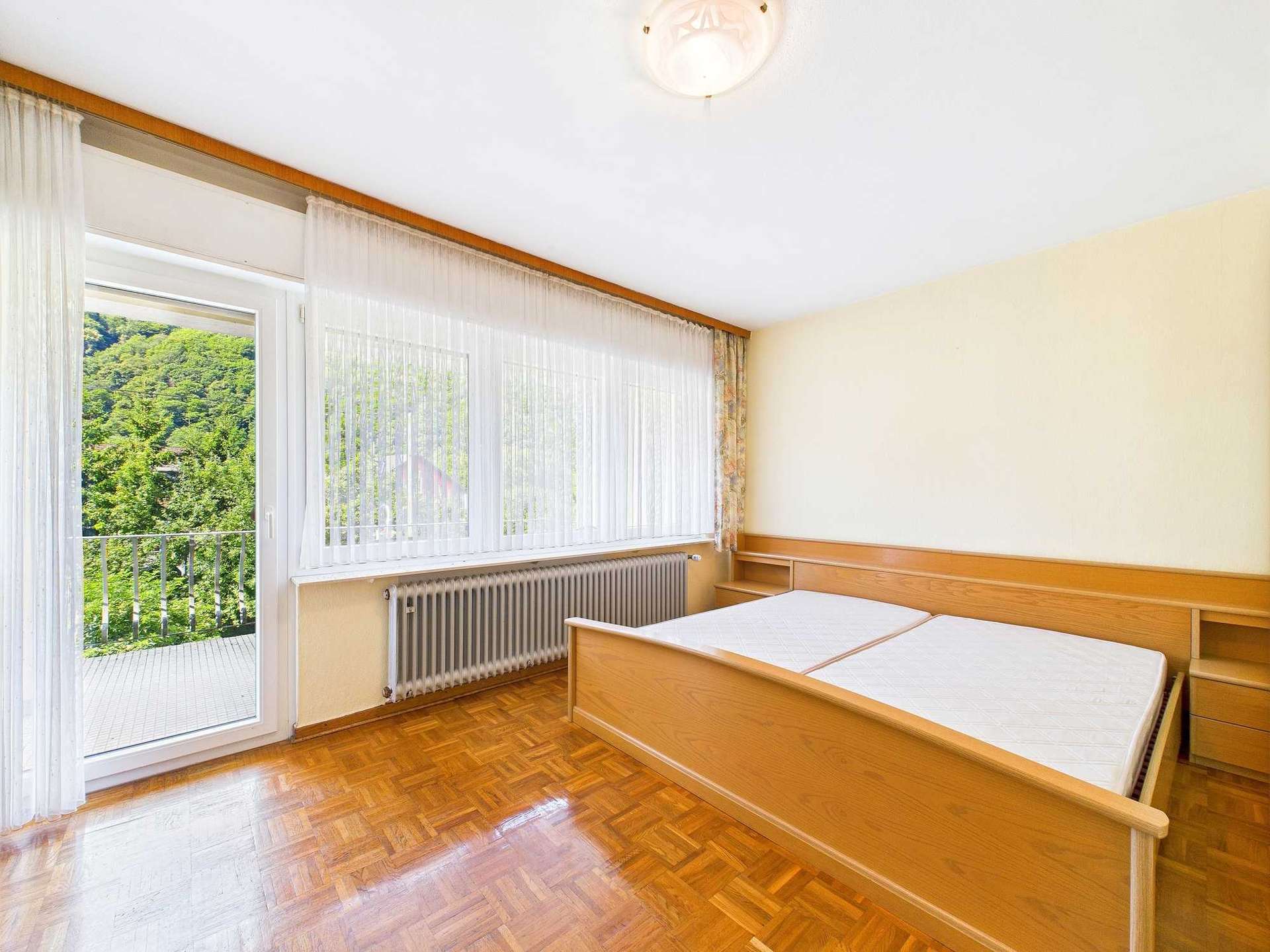 Im ersten Obergeschoss befinden sich insgesamt fünf Schlafzimmer. Drei davon verfügen über integrierte Duschbäder – zwei aus den 1980er Jahren, eines modernisiert und mit Tageslicht. Zwei weitere Zimmer sind mit Waschbecken ausgestattet. Eine große Terrasse auf der Rückseite sowie eine Loggia zur Straßenseite bieten zusätzlichen Freiraum und schöne Ausblicke.