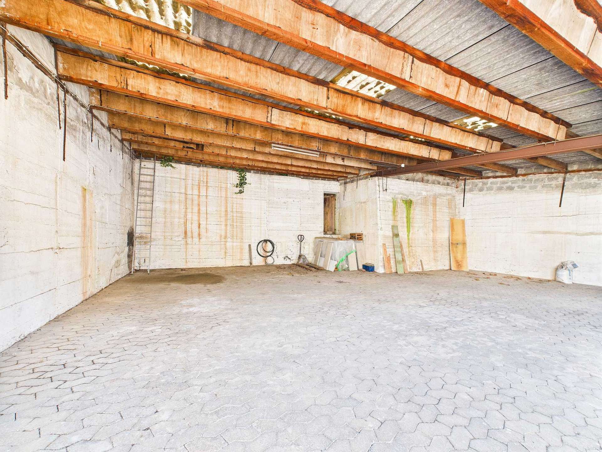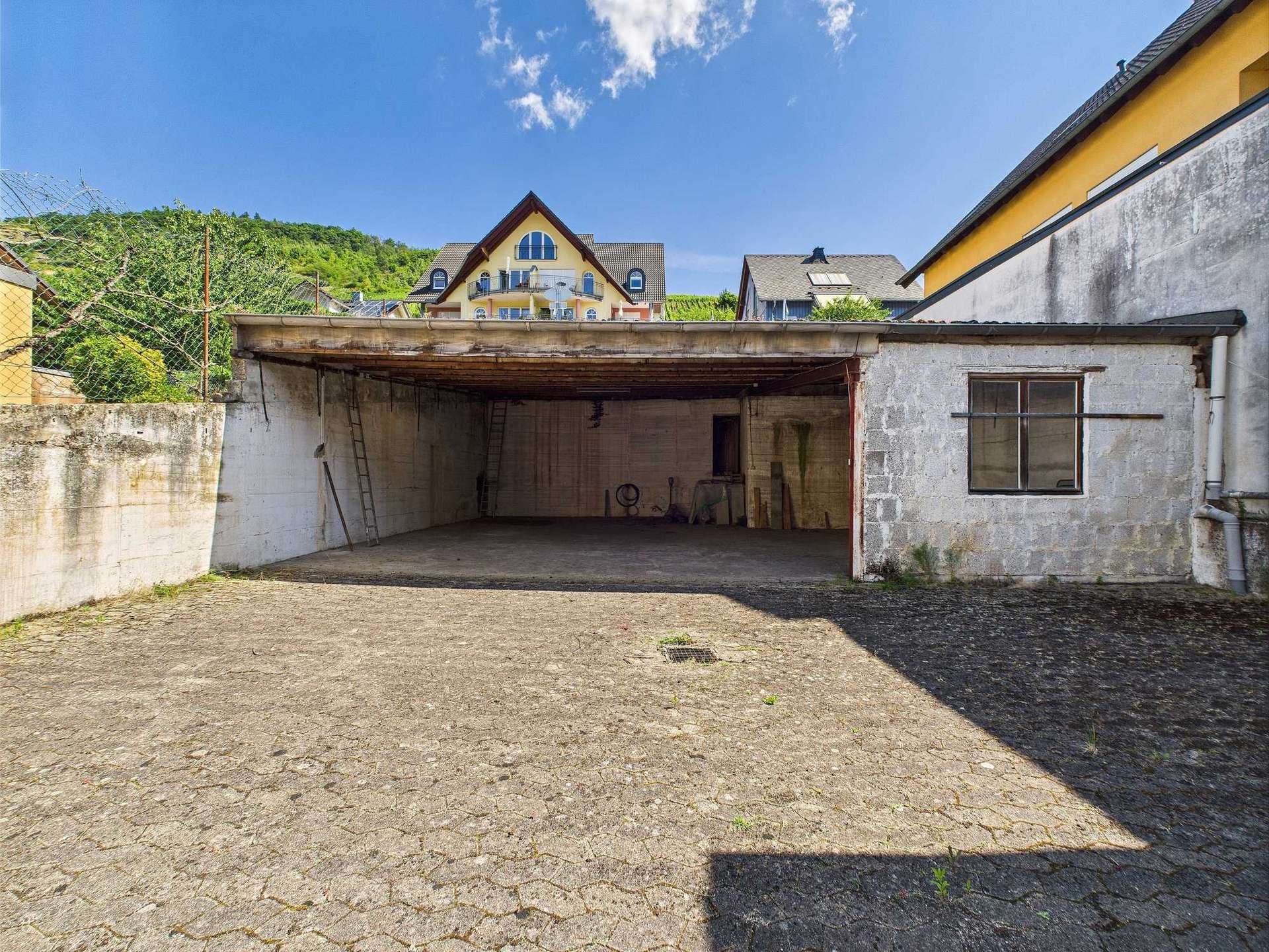 Vor und hinter dem Haus finden sich großzügige Terrassenbereiche, die zum Entspannen und Genießen einladen. Der gepflasterte Hof hinter dem Haus eignet sich hervorragend für gesellige Grillabende oder ruhige Stunden im Freien. Ein weiteres Highlight ist der große Unterstand hinter dem Haus – ehemals für Traktoren und Anhänger genutzt – der sich heute ideal als überdachter Stellplatz oder Carport für mehrere Fahrzeuge eignet. Zusätzlich bietet die lange Garage Platz für bis zu drei Autos hintereinander und verfügt über einen Aufzug in einen der Kellerräume – ein echtes Plus an Komfort und Barrierefreiheit.