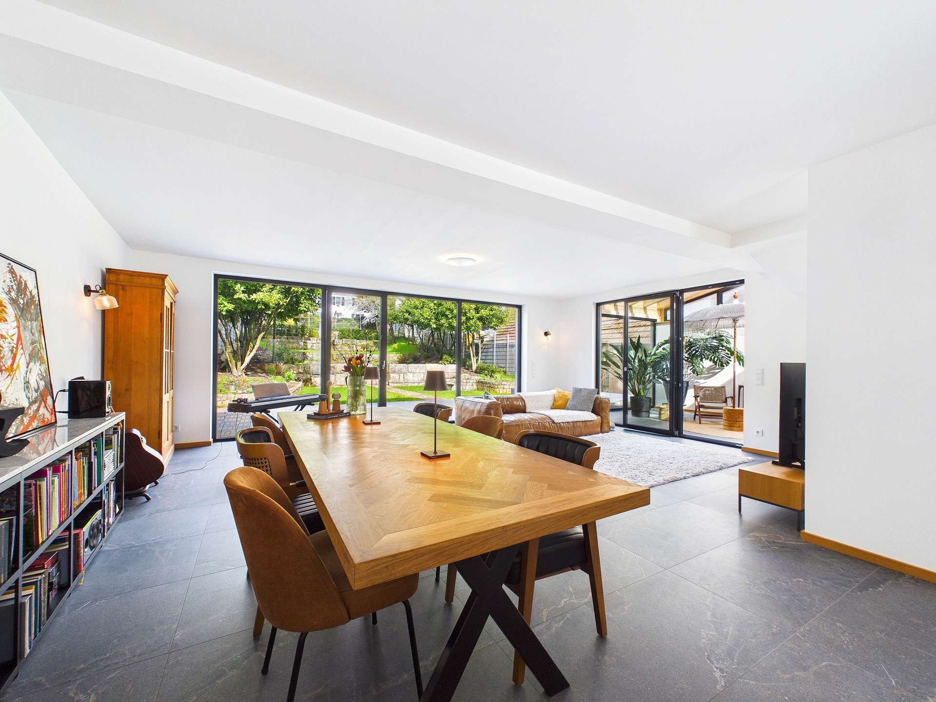 Im ersten Obergeschoss öffnet sich der Blick auf die hochwertig gestaltete Hauptwohnung. Ein großzügiger Wohn und Essbereich mit integrierter Küche bildet den Mittelpunkt dieses Zuhauses und schafft mit seiner Offenheit und Eleganz eine Atmosphäre, in der man sich sofort angekommen fühlt. Der angrenzende Wintergarten erweitert den Wohnraum auf besonders schöne Weise und sorgt für ein lichtdurchflutetes Ambiente mit ganz besonderem Charme. Auf dieser Ebene befinden sich außerdem ein Büro, ein Gäste WC, ein offen gestaltetes Schlafzimmer mit Ankleide, das Elternbad sowie ein Hauswirtschaftsraum. So verbindet sich stilvoller Wohnkomfort mit einer durchdachten Alltagstauglichkeit.