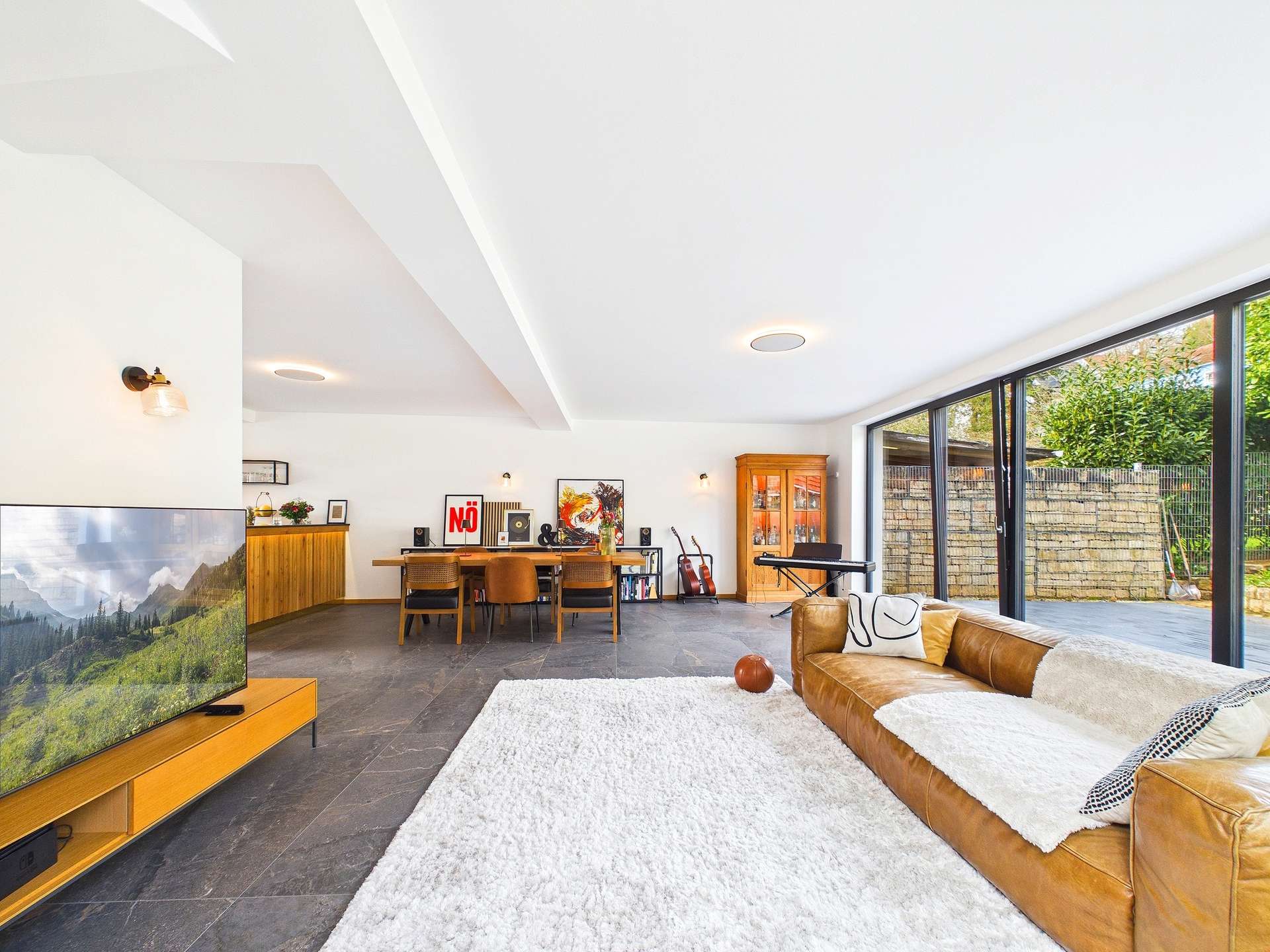Bereits im Untergeschoss zeigt sich die beeindruckende Vielseitigkeit der Immobilie. Der linke Gebäudeteil umfasst die Garage, den Maschinenraum sowie einen großzügigen Hobbybereich mit Küche. Ein angrenzendes Bad ist bereits vorgesehen und wartet noch auf die Fertigstellung. Diese Ebene bietet ideale Voraussetzungen zum Werkeln, für Hobbys, ein Gewerbe oder auch für die stilvolle Unterbringung besonderer Liebhaberstücke. Von hier aus gelangen Sie zudem in den terrassenartig angelegten Garten, der dem Haus eine ganz besondere Atmosphäre verleiht und als geschützter Rückzugsort zum Entspannen und Genießen einlädt.