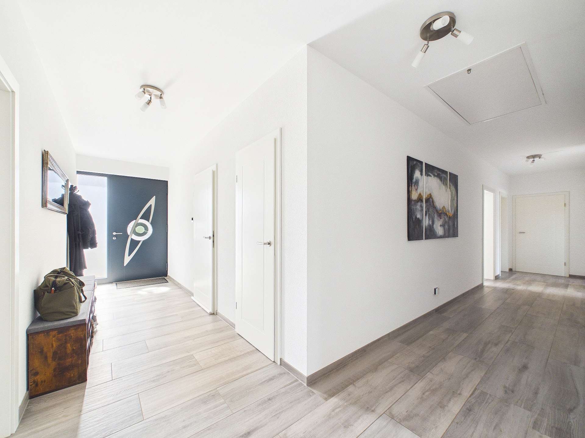 Bereits beim Betreten des Hauses empfängt Sie ein eleganter Flur, der dem Bungalow eine repräsentative und zugleich einladende Note verleiht. Von hier aus erschließen sich die einzelnen Räume auf besonders angenehme Weise. Zur linken Seite befindet sich ein ruhig gelegenes Büro, das ideale Voraussetzungen für konzentriertes Arbeiten im Homeoffice bietet. Ebenfalls in diesem Bereich ist das Gäste-WC untergebracht, praktisch und geschmackvoll in das Raumkonzept integriert.