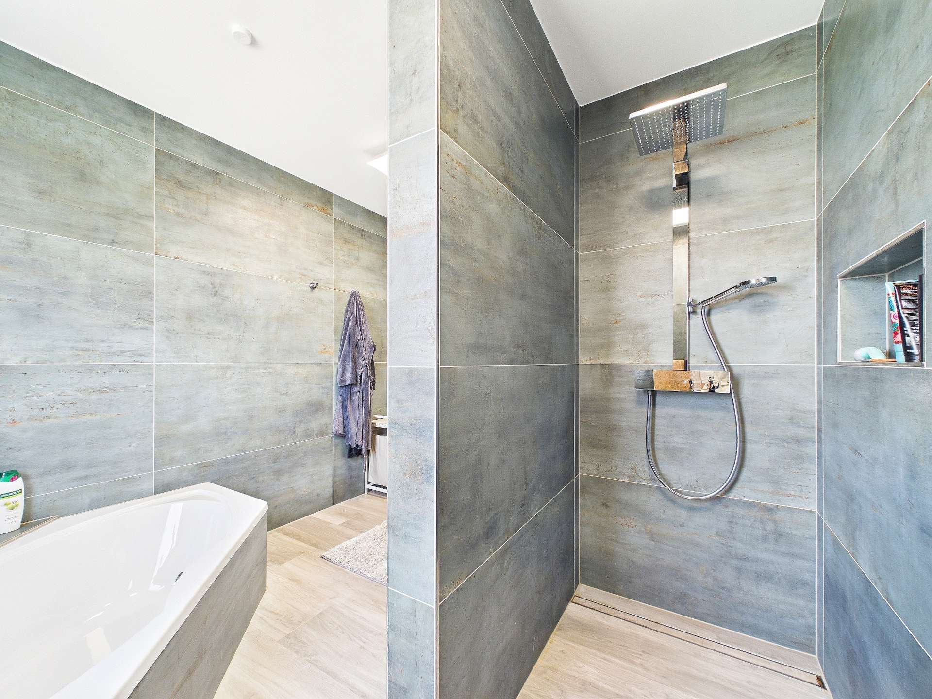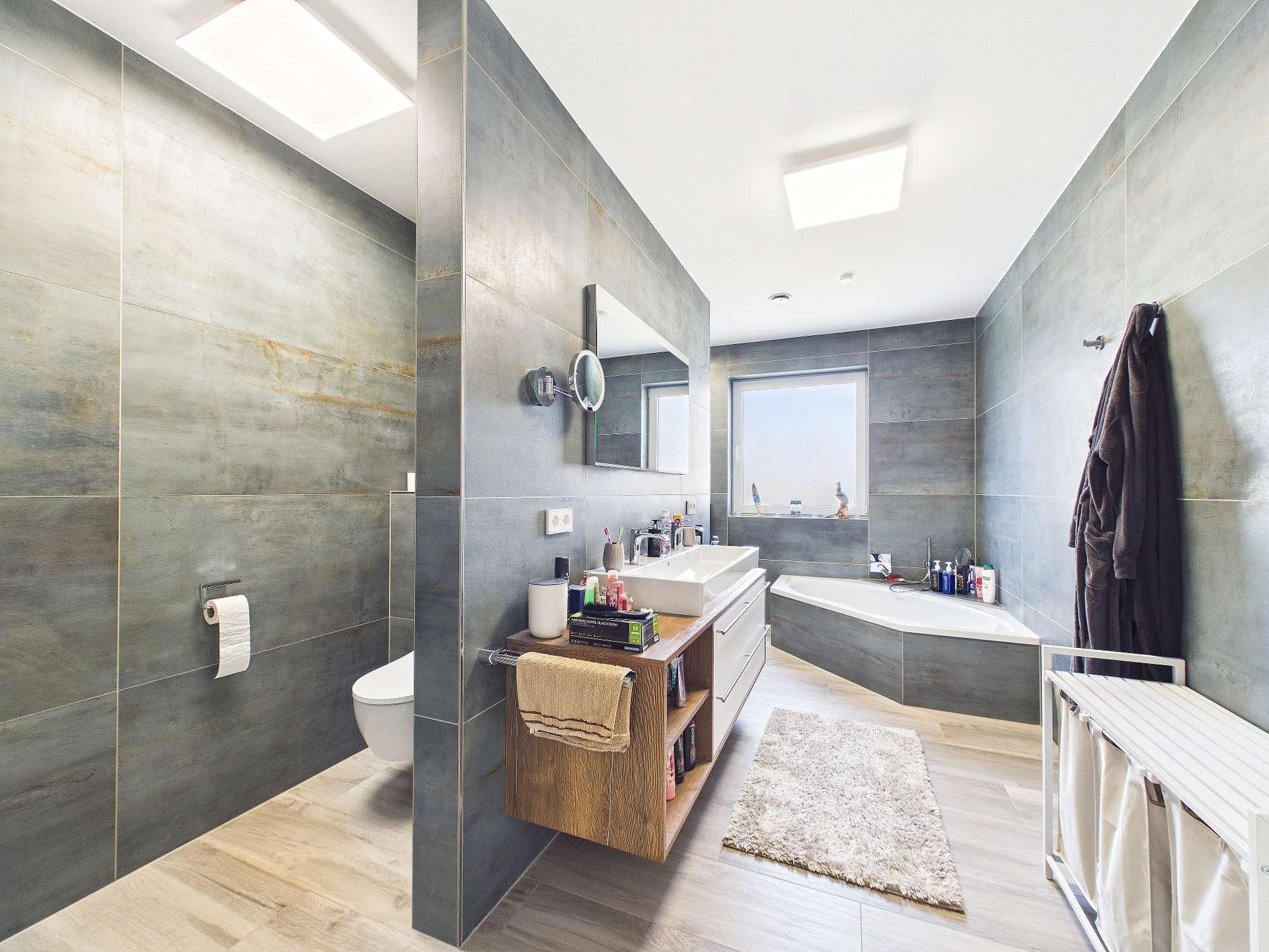 Im weiteren, ruhigeren Teil des Bungalows setzt sich die durchdachte Aufteilung konsequent fort. Hier stehen Ihnen drei flexibel nutzbare Zimmer zur Verfügung, die sich ideal als Schlafzimmer, Kinderzimmer, Gästezimmer oder Hobbyraum gestalten lassen. Das großzügige Hauptbad in T-Form überzeugt mit einer bodentiefen Dusche, einer Toilette sowie einer Eckbadewanne und schafft damit eine gelungene Verbindung aus Komfort und Wohlfühlcharakter. Ergänzt wird dieser Bereich durch einen weiteren Abstellraum sowie den Heizungsraum, der zusätzlich einen direkten Zugang nach außen bietet.
