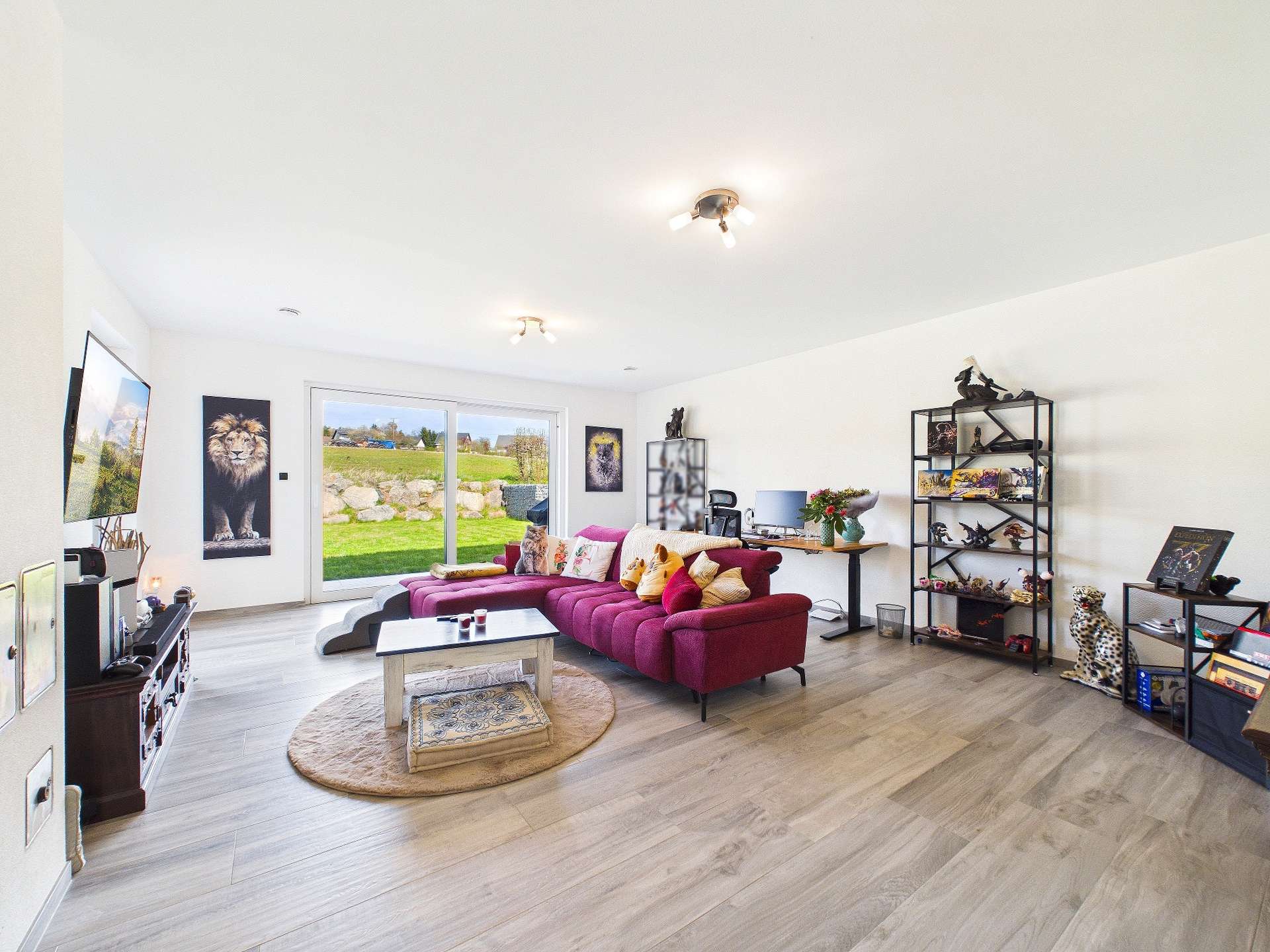Geradeaus gelangen Sie in das Herzstück des Hauses: das großzügige, lichtdurchflutete Wohnzimmer. Große Fensterflächen schaffen eine helle, freundliche Wohnatmosphäre und verbinden den Innenbereich harmonisch mit dem Außenbereich. Von hier aus gelangen Sie direkt auf die blickgeschützte Terrasse und in den weitläufigen Garten, ein wunderbarer Ort für entspannte Stunden im Freien, gesellige Abende oder ruhige Momente mit viel Privatsphäre.