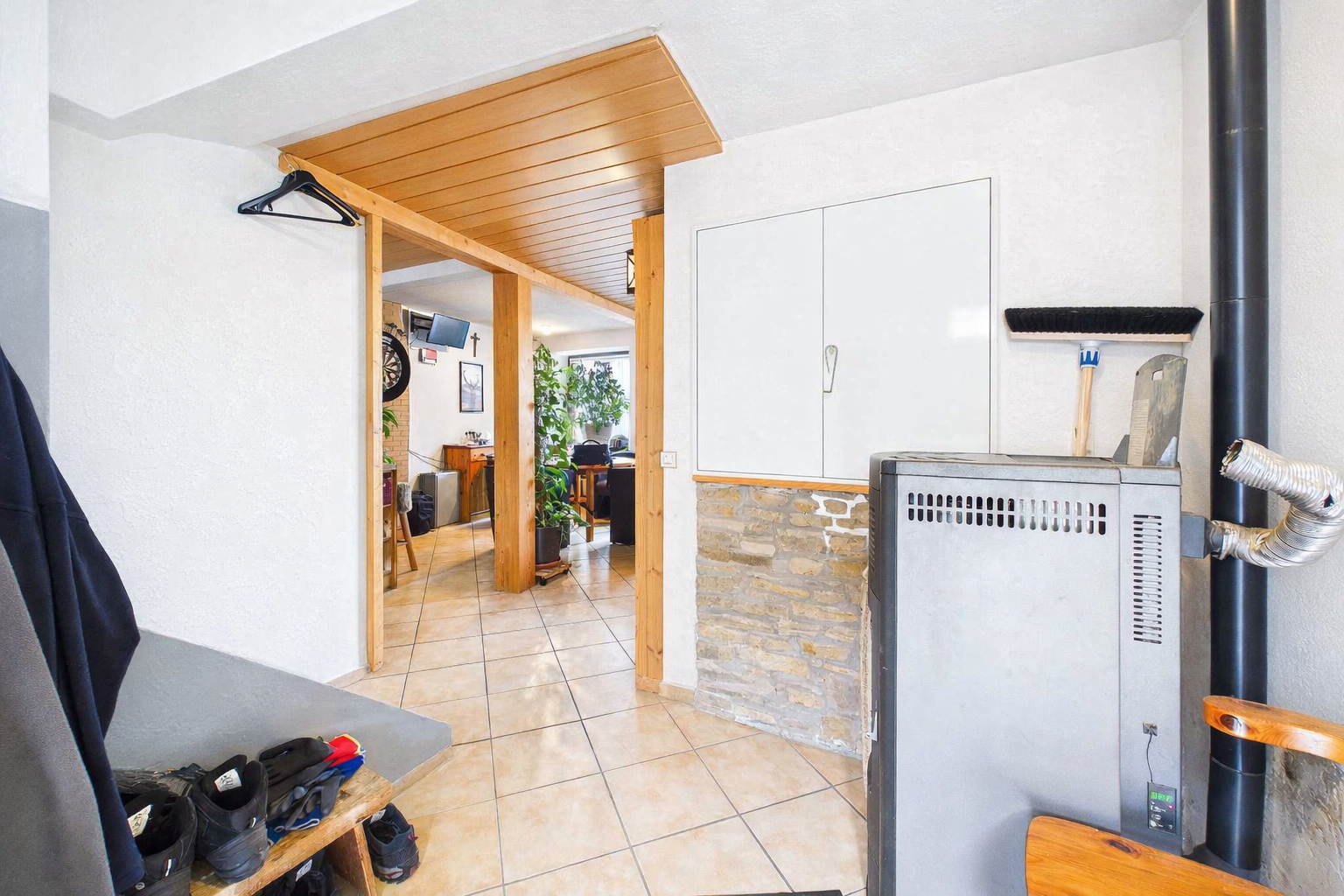 Beheizt wird es mittels eines modernen Pelletofens, der sich im Eingangsbereich des Hauses im Erdgeschoss befindet. Dieser Ofen ist aus 2019. Ein zweiter Pelletofen kann im Obergeschoss aufgestellt werden. Die Warmwasseraufbereitung erfolgt über einen Durchlauferhitzer.
