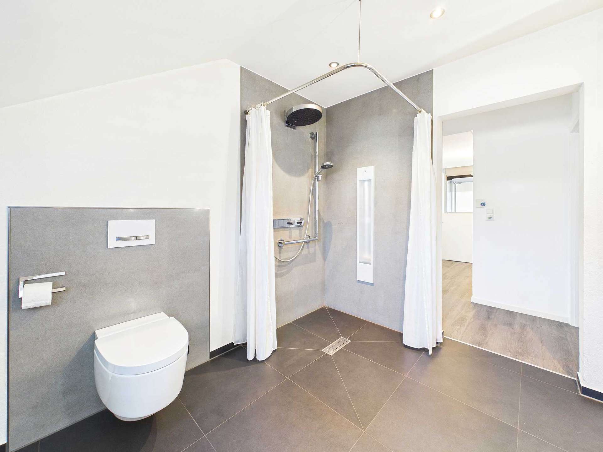 Ergänzt wird das Raumangebot im Erdgeschoss durch ein Gäste-WC sowie einen direkten Zugang zur Garage. Diese ist mit einem elektrischen Sektionaltor inklusive Fernbedienung ausgestattet.