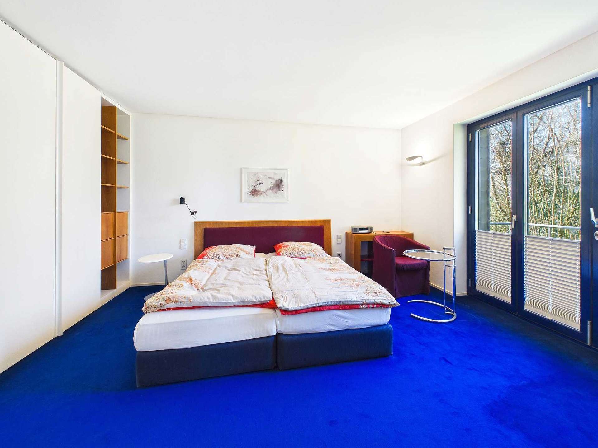 Der Wohn- und Kaminbereich ist über eine kleine Treppe mit drei Stufen erreichbar. Das Wohnzimmer zeichnet sich durch seine hohen Decken und großflächigen, auffaltbaren Fensterfronten aus, die eine direkte Verbindung zur Terrasse und zum Garten hinter dem Haus schaffen und den Außenbereich optisch in den Wohnraum integrieren. Vor einigen Jahren wurde hier ein Aufzug installiert, der das Erdgeschoss komfortabel mit dem Obergeschoss verbindet.