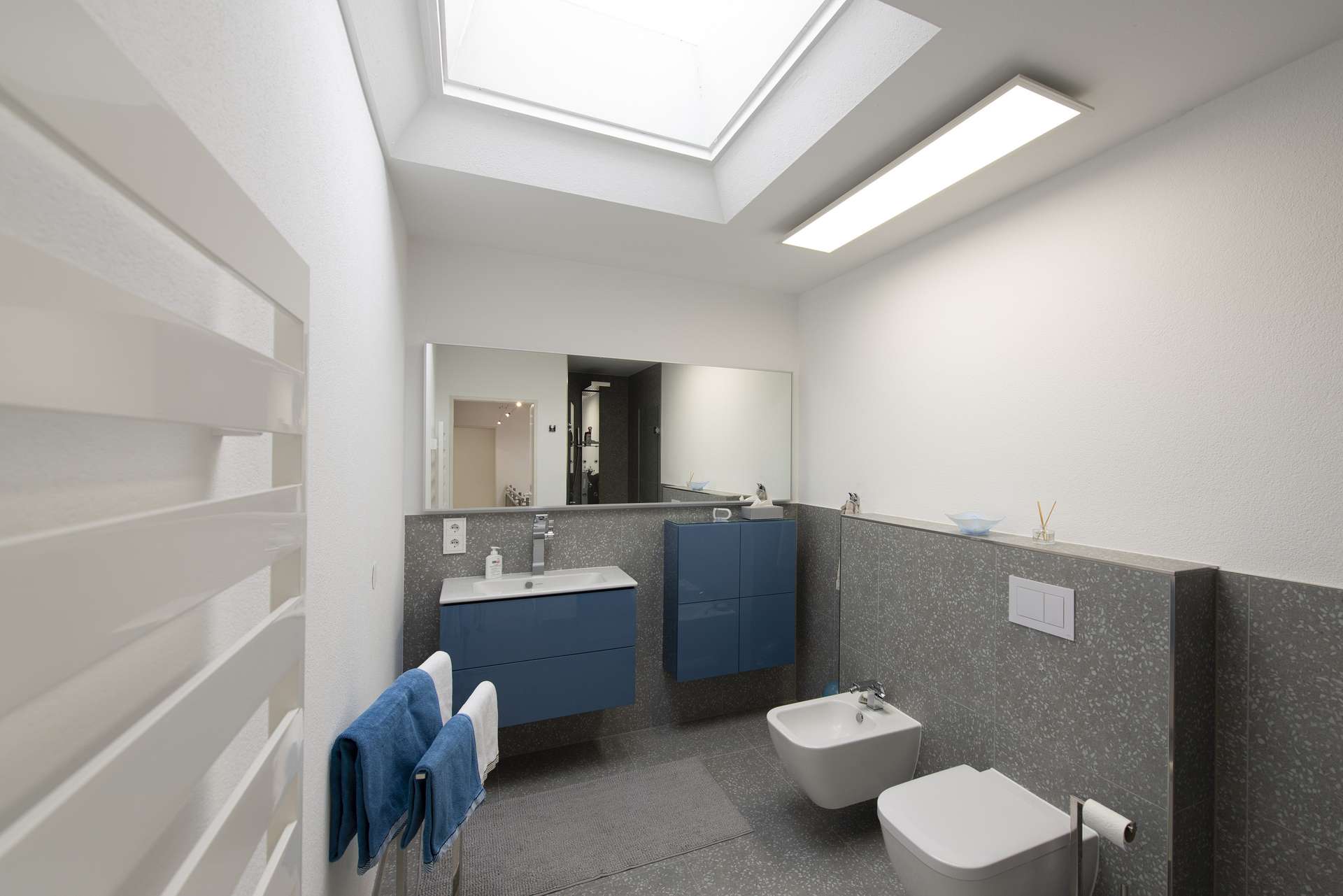 Im Obergeschoss erwarten Sie bis zu drei gut geschnittene Schlafzimmer, eines davon mit Balkon und traumhaftem Fernblick ins Grüne – ein Ort zum Durchatmen! Das stilvolle Familienbad wurde 2021 vollständig saniert und begeistert mit hochwertiger Ausstattung, bodentiefer XXL-Dusche und modernem Design.