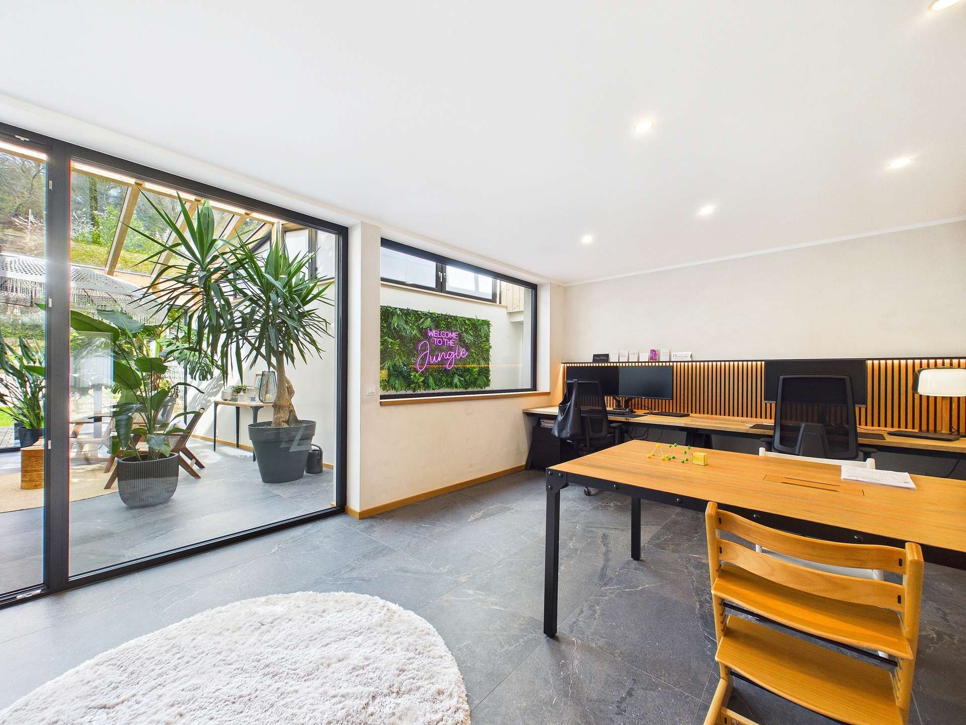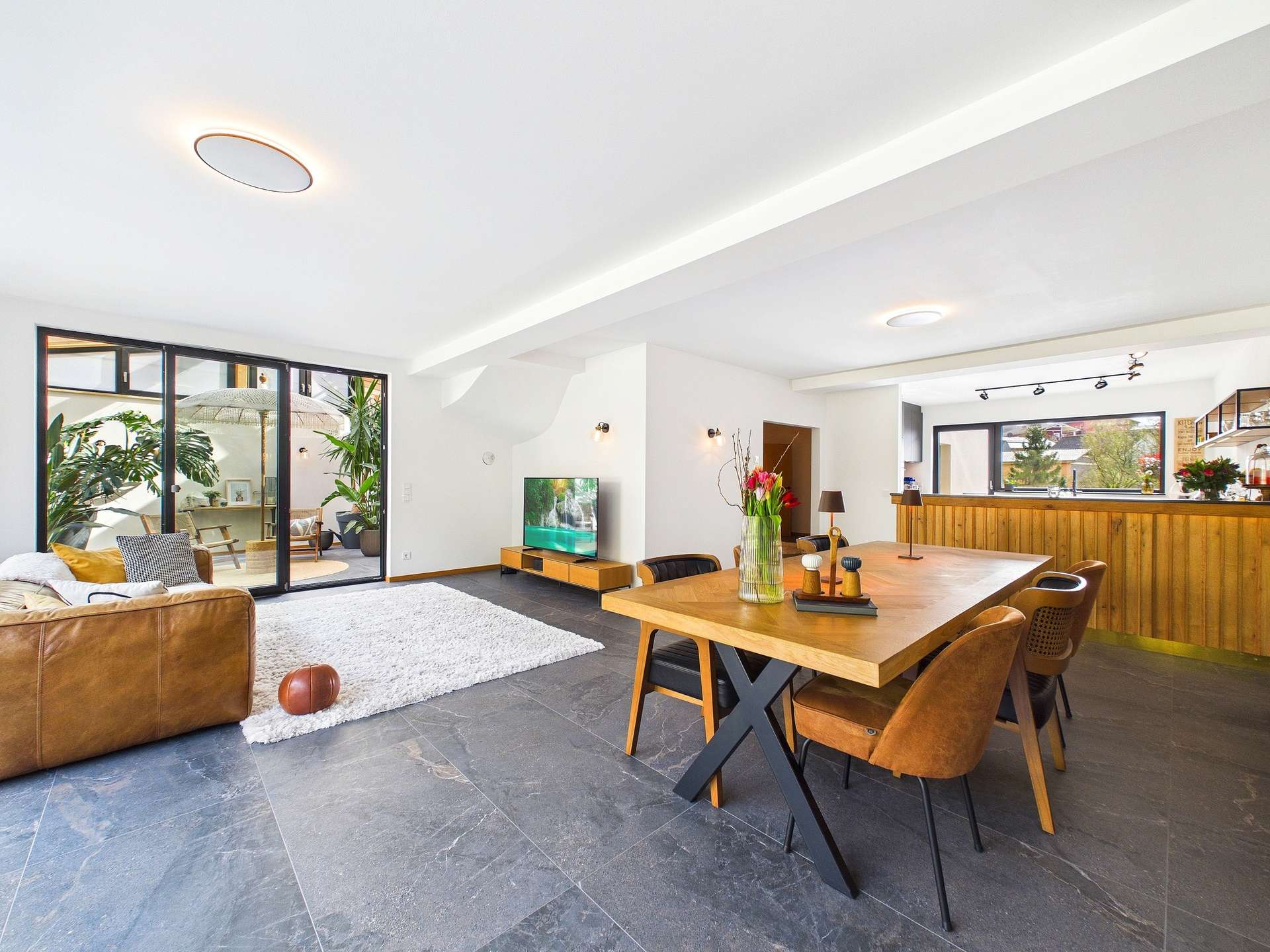 Im ersten Obergeschoss öffnet sich der Blick auf die hochwertig gestaltete Hauptwohnung. Ein großzügiger Wohn und Essbereich mit integrierter Küche bildet den Mittelpunkt dieses Zuhauses und schafft mit seiner Offenheit und Eleganz eine Atmosphäre, in der man sich sofort angekommen fühlt. Der angrenzende Wintergarten erweitert den Wohnraum auf besonders schöne Weise und sorgt für ein lichtdurchflutetes Ambiente mit ganz besonderem Charme. Auf dieser Ebene befinden sich außerdem ein Büro, ein Gäste WC, ein offen gestaltetes Schlafzimmer mit Ankleide, das Elternbad sowie ein Hauswirtschaftsraum. So verbindet sich stilvoller Wohnkomfort mit einer durchdachten Alltagstauglichkeit.