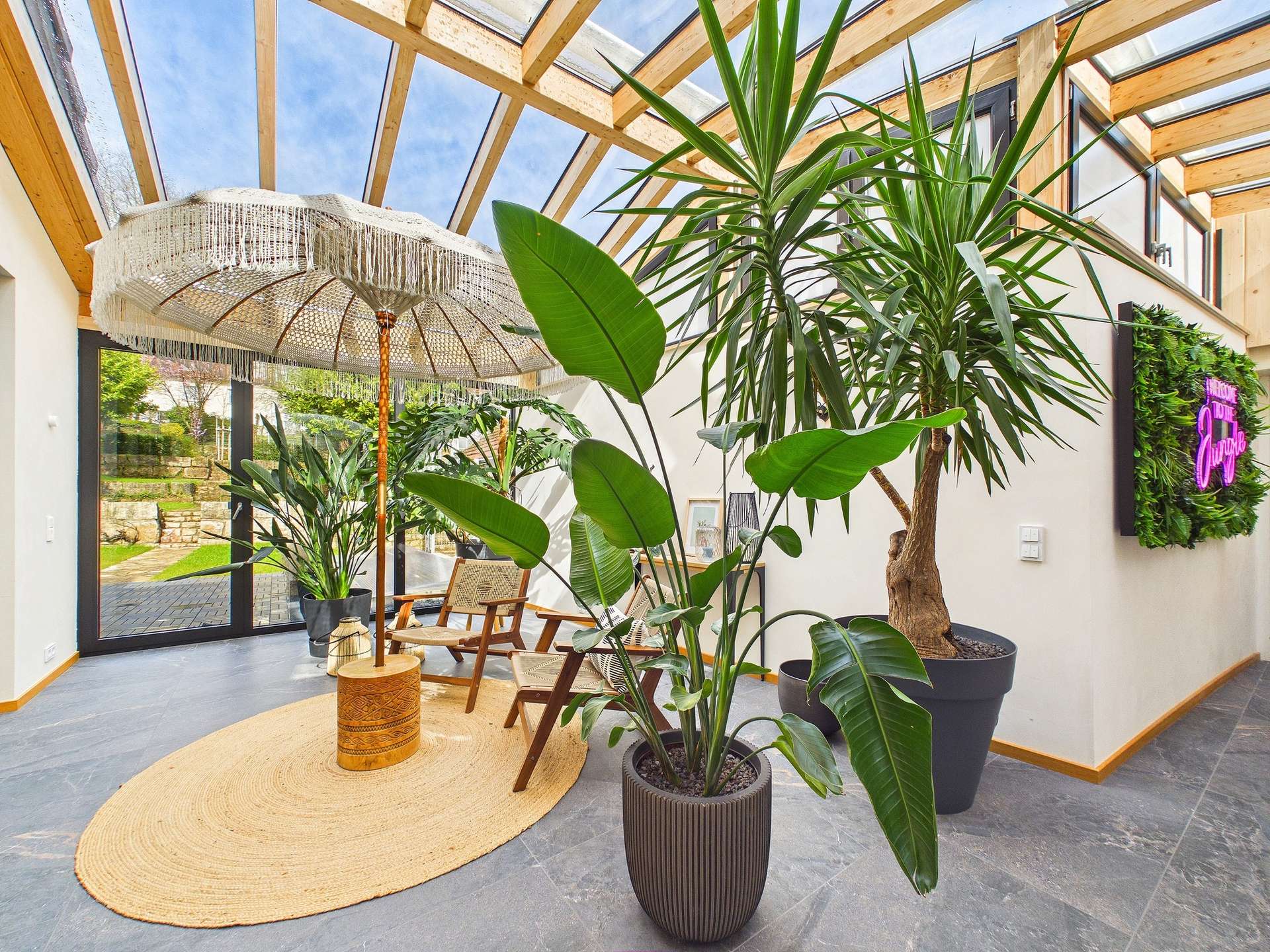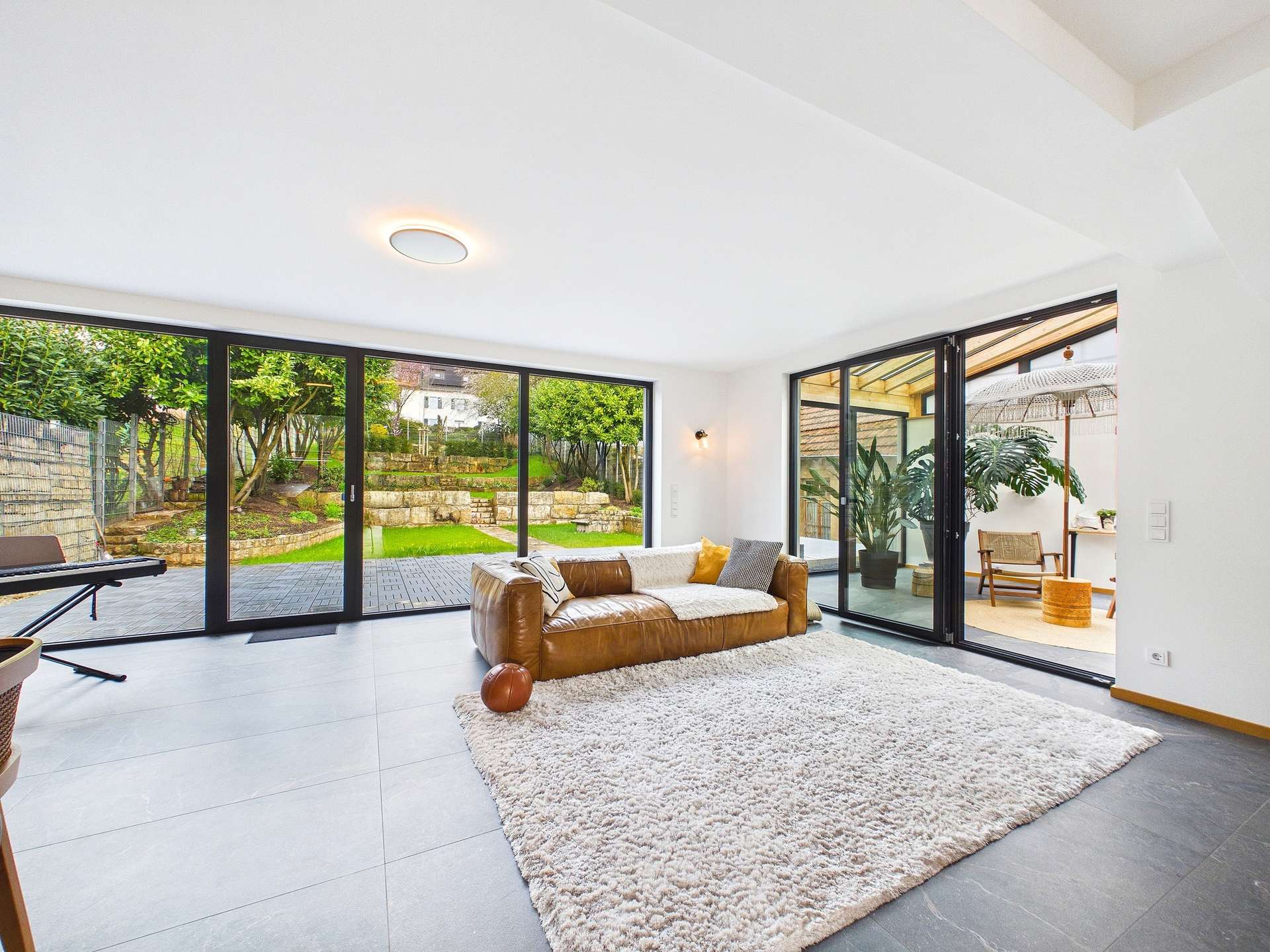 Zusätzlichen Gestaltungsspielraum bietet der rechte Teil des Hauses, der sich derzeit noch im Rohbauzustand befindet und aktuell als Hobbyraum genutzt wird. Dank separatem Eingang sowie Zugang über den Wintergarten eröffnet sich hier ein außergewöhnlich flexibles Nutzungspotenzial, sei es als zusätzliche Wohnfläche, Atelier, Büro, Wellnessbereich oder individueller Rückzugsort. Hier können Sie Ihre Vorstellungen auf exklusive Weise verwirklichen und dem Haus eine weitere ganz persönliche Note verleihen.