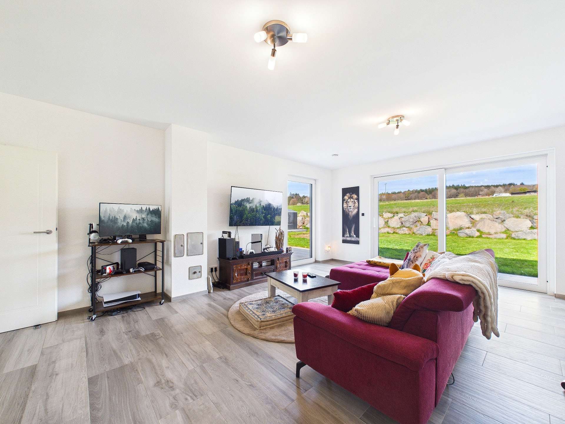 Geradeaus gelangen Sie in das Herzstück des Hauses: das großzügige, lichtdurchflutete Wohnzimmer. Große Fensterflächen schaffen eine helle, freundliche Wohnatmosphäre und verbinden den Innenbereich harmonisch mit dem Außenbereich. Von hier aus gelangen Sie direkt auf die blickgeschützte Terrasse und in den weitläufigen Garten, ein wunderbarer Ort für entspannte Stunden im Freien, gesellige Abende oder ruhige Momente mit viel Privatsphäre.