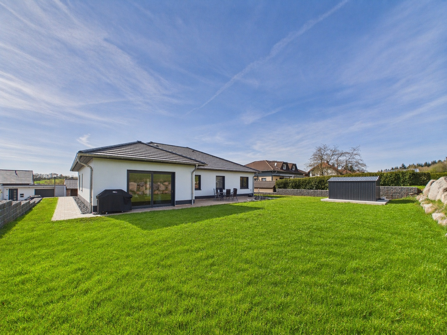 Dieser außergewöhnlich ansprechende Bungalow aus dem Baujahr 2021 vereint modernes Wohnen auf einer Ebene mit stilvoller Architektur, durchdachter Raumaufteilung und einem hohen Maß an Wohnkomfort. Auf ca. 170 m² Wohnfläche und einem ca. 864 m² großen Grundstück eröffnet sich hier ein Zuhause, das gleichermaßen durch Großzügigkeit, Eleganz und Alltagstauglichkeit überzeugt. Ob für anspruchsvolle Paare, Bungalow-Liebhaber, Menschen mit dem Wunsch nach barrierearmem Wohnen oder eine junge Familie mit bis zu zwei Kindern, diese Immobilie bietet beste Voraussetzungen für ein komfortables Leben in moderner Umgebung.