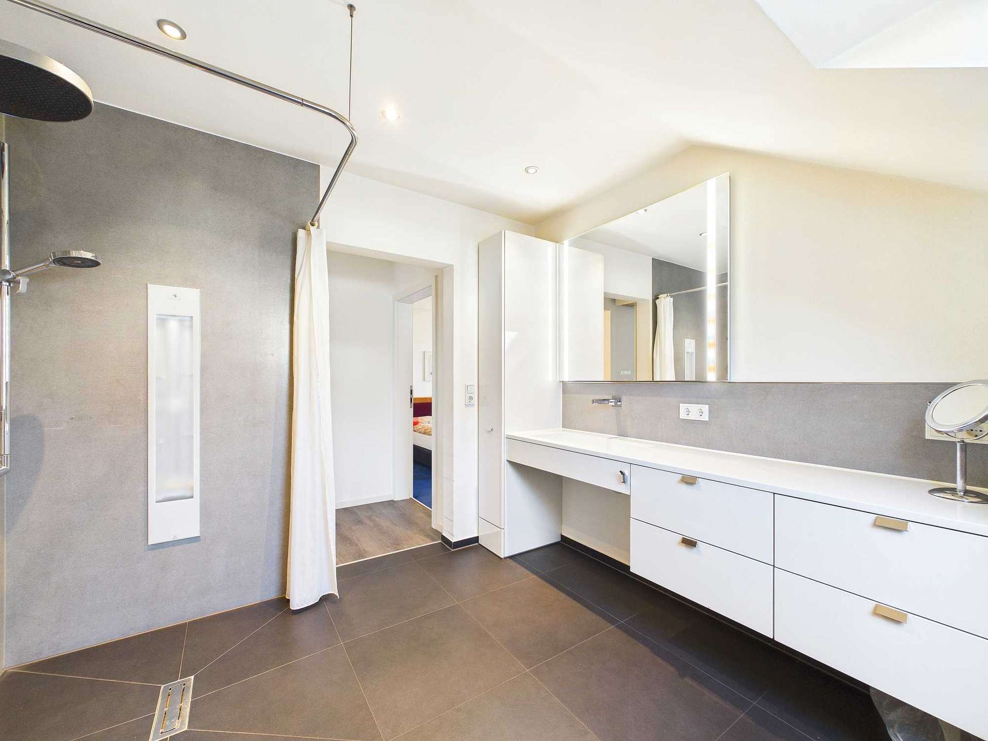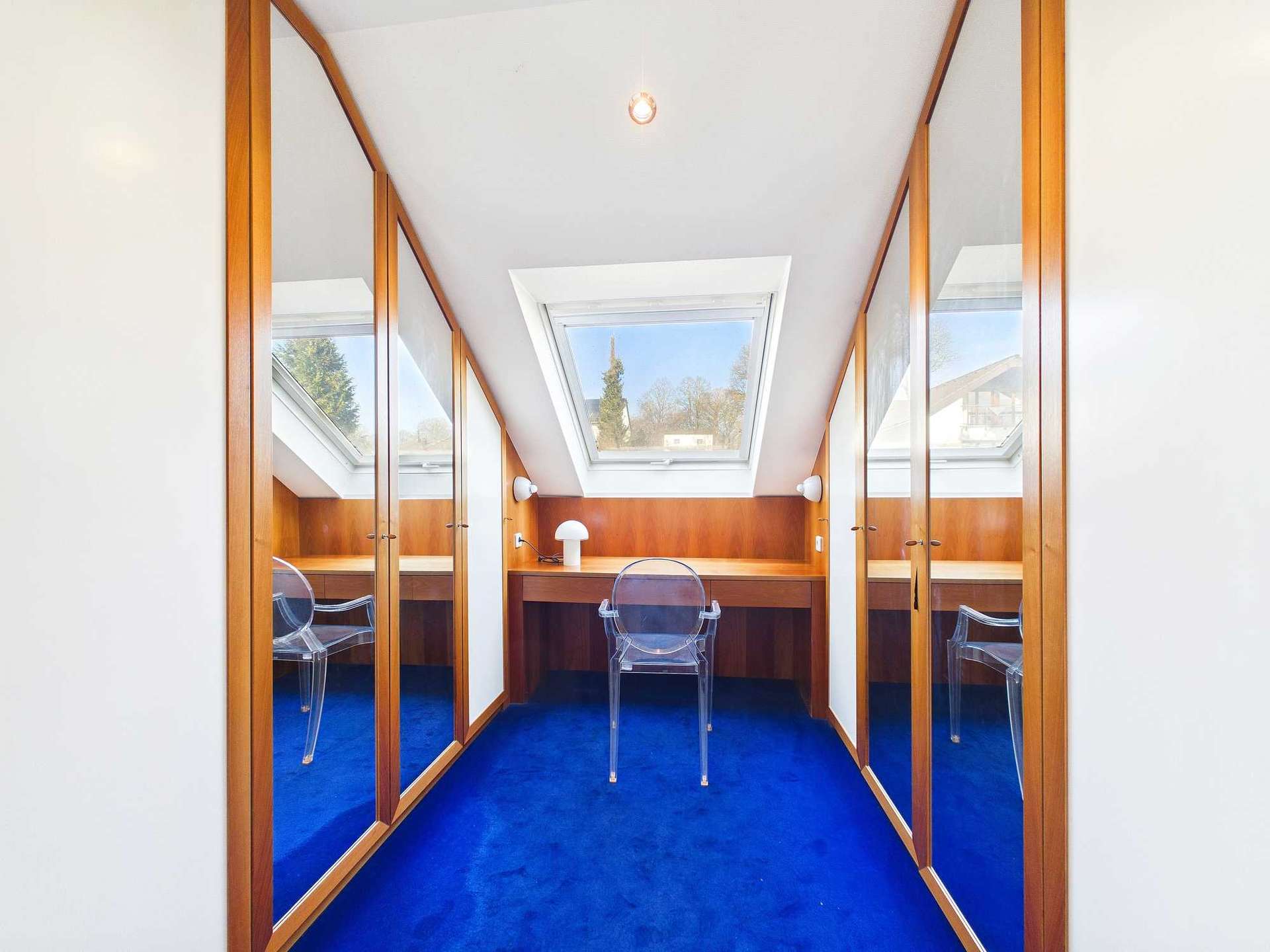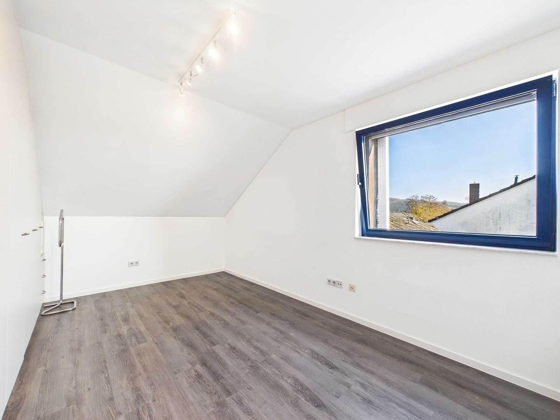 Im ausgebauten Dachgeschoss liegen das Elternschlafzimmer mit separater Ankleide, ein Kinderzimmer sowie ein weiteres, kleineres Zimmer, das sich als Arbeits- oder Gästezimmer eignet. Die Trennwand zwischen Schlafzimmer und Ankleide könnte voraussichtlich entfernt werden, wodurch sich die Raumfläche bei Bedarf vergrößern ließe. Das Badezimmer auf dieser Ebene wurde vor wenigen Jahren modernisiert und verfügt über eine großzügige, bodentiefe Dusche.