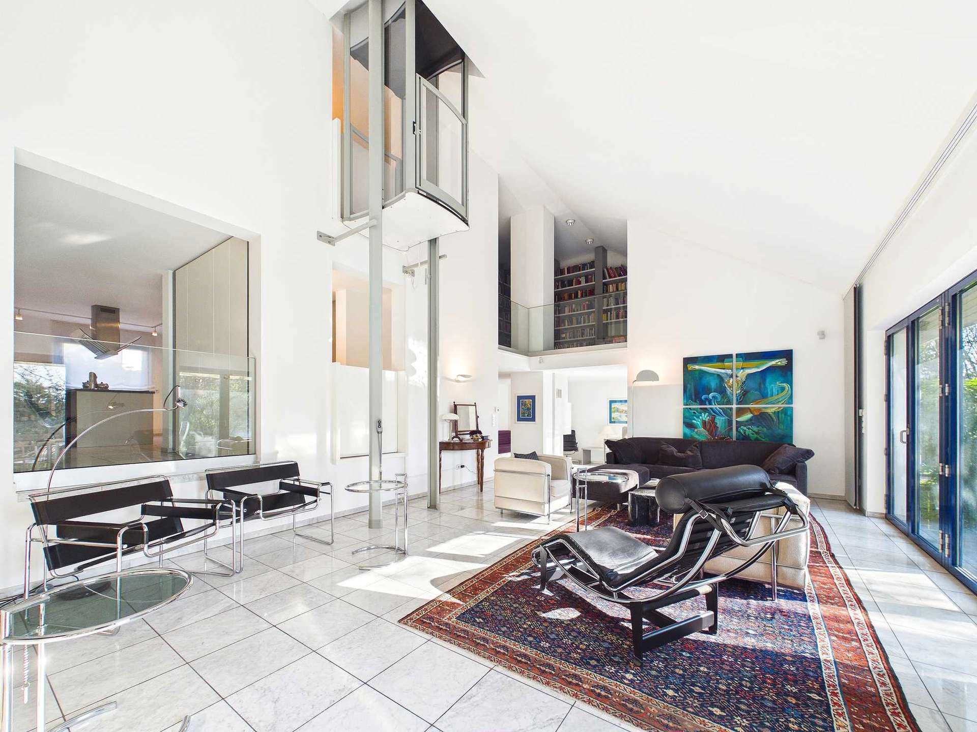 Der Wohn- und Kaminbereich ist über eine kleine Treppe mit drei Stufen erreichbar. Das Wohnzimmer zeichnet sich durch seine hohen Decken und großflächigen, auffaltbaren Fensterfronten aus, die eine direkte Verbindung zur Terrasse und zum Garten hinter dem Haus schaffen und den Außenbereich optisch in den Wohnraum integrieren. Vor einigen Jahren wurde hier ein Aufzug installiert, der das Erdgeschoss komfortabel mit dem Obergeschoss verbindet.
