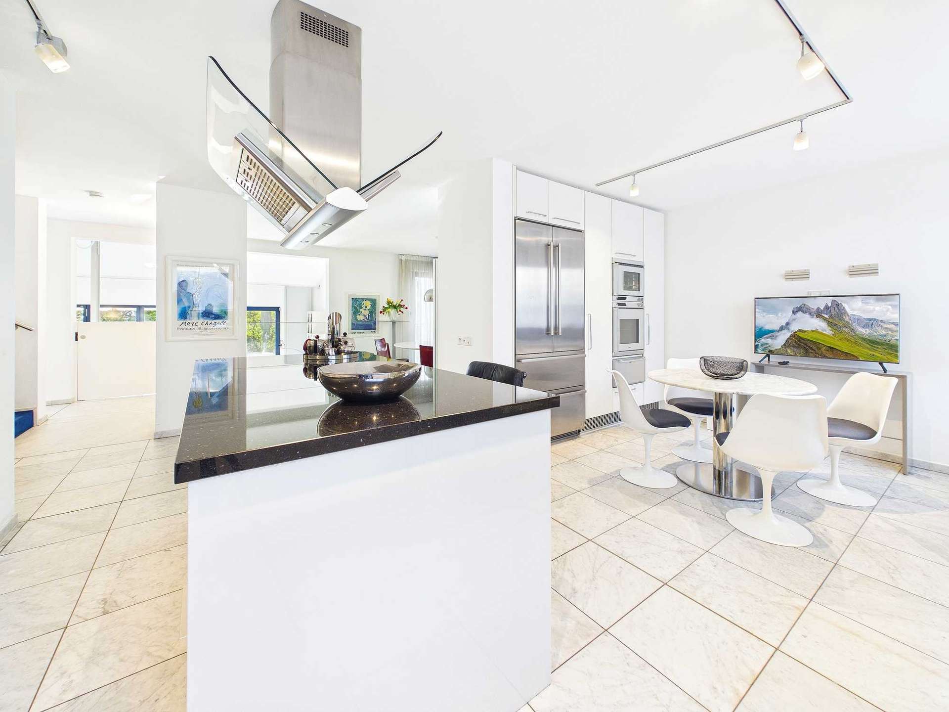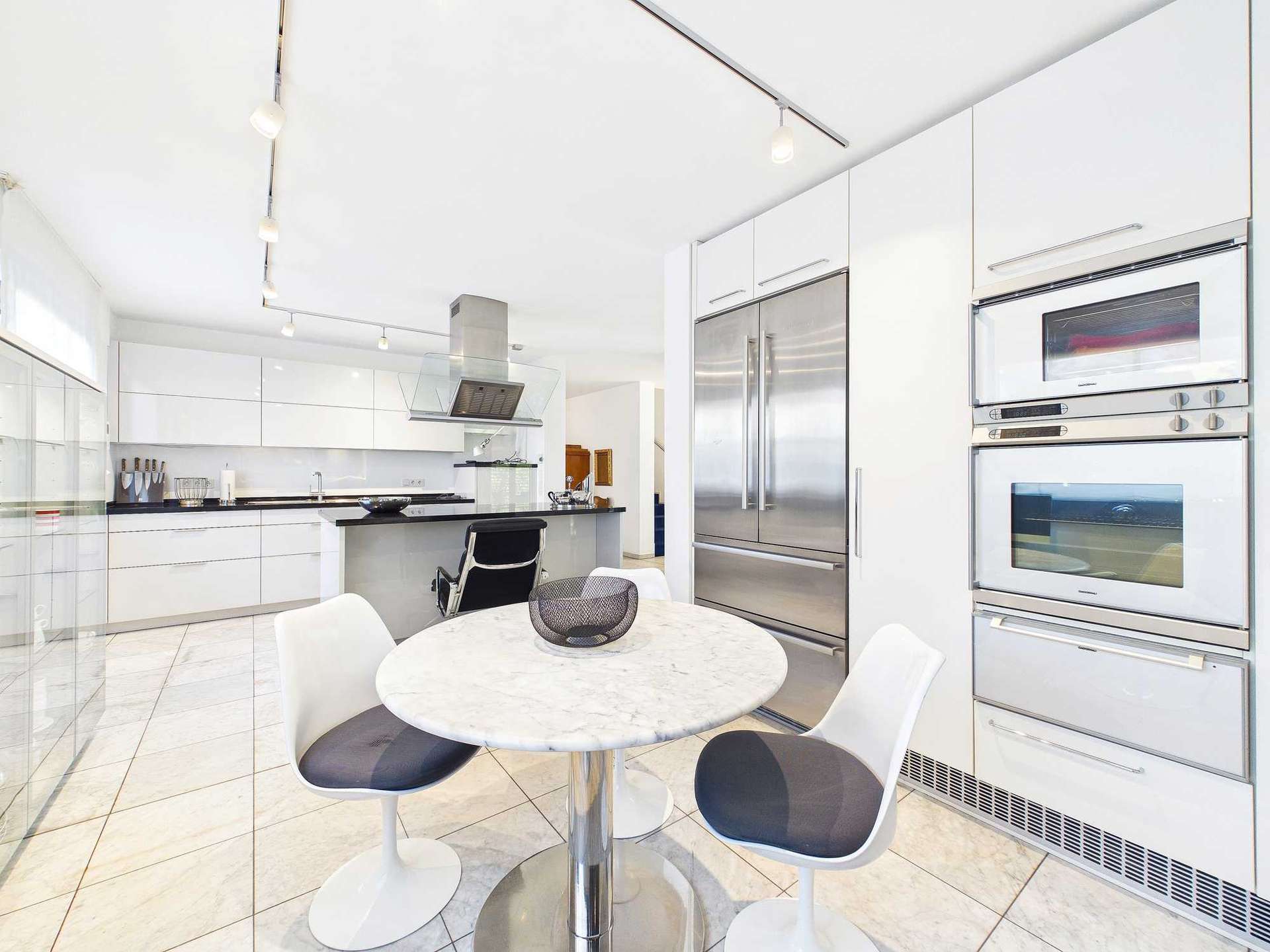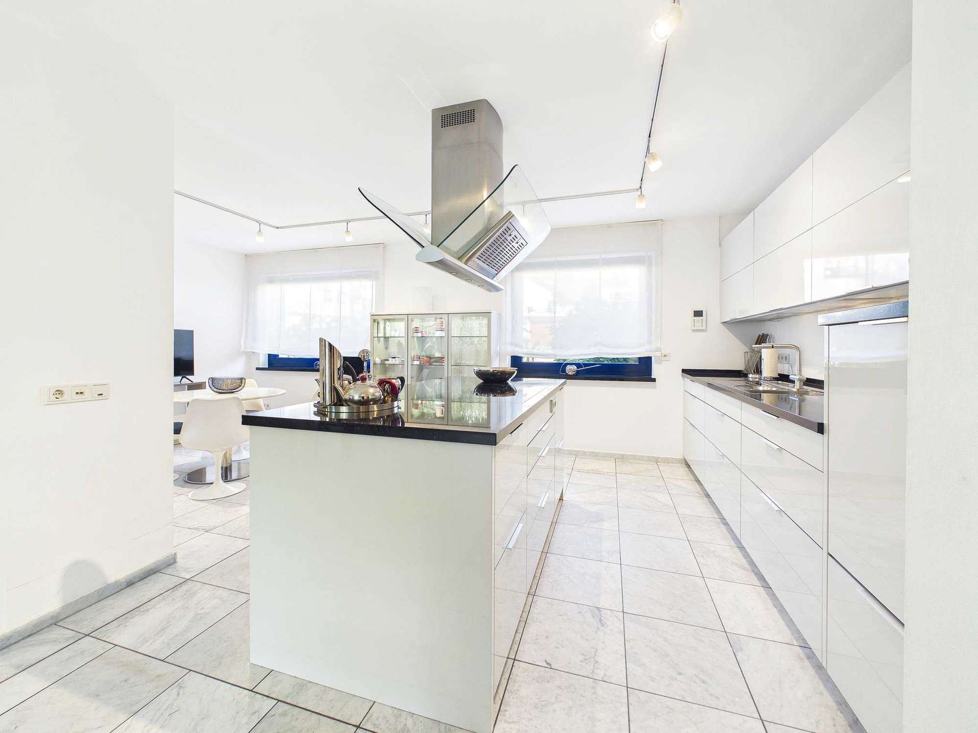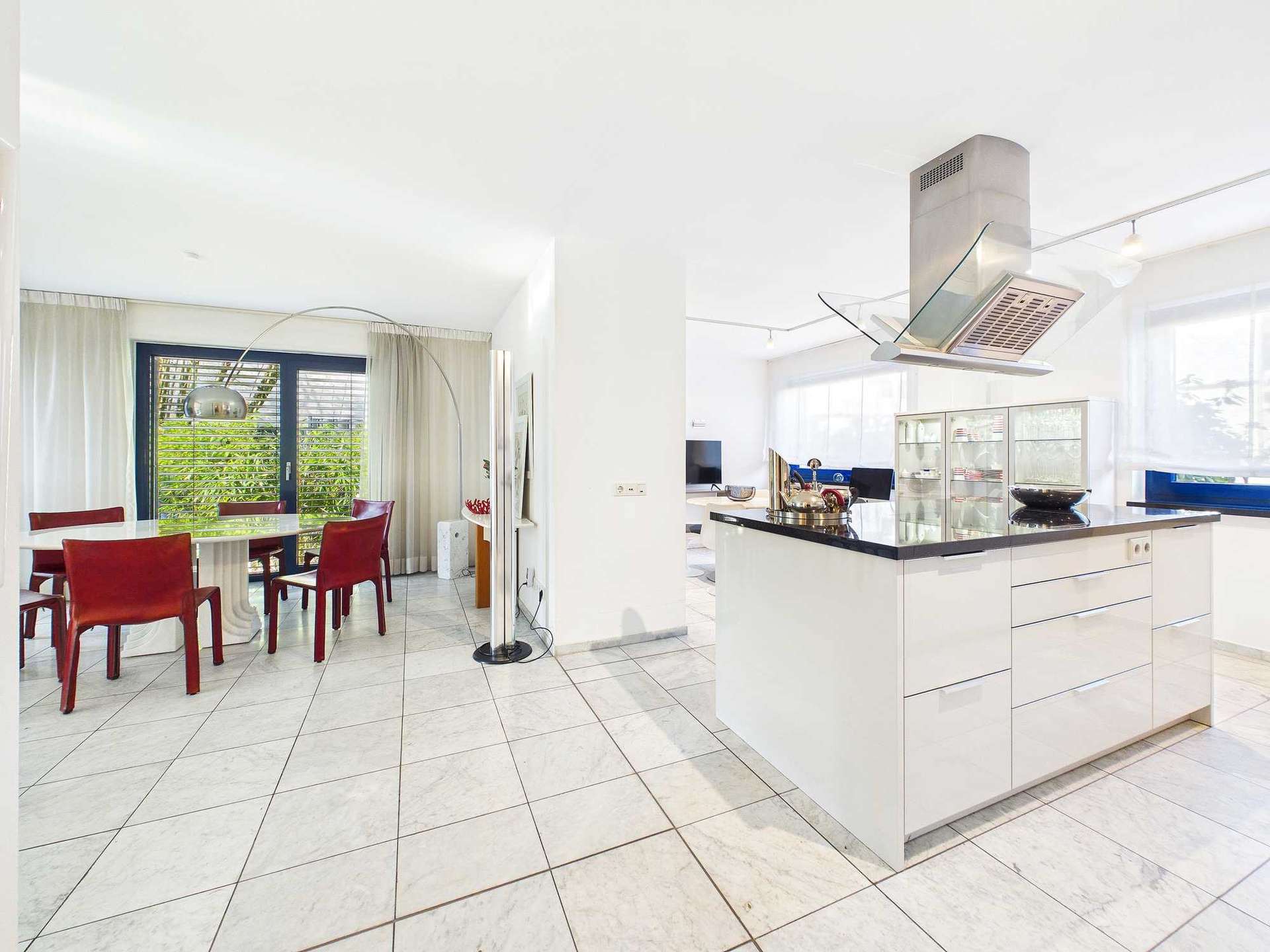 Im Erdgeschoss betritt man zunächst eine großzügig gestaltete, offen gehaltene Diele mit Marmorboden. Der hochwertige Bodenbelag ist auf der gesamten Etage verlegt und sorgt für ein einheitliches Erscheinungsbild. Der Übergang zur Küche ist offen gestaltet. Diese verfügt über einen angeschlossenen Essbereich sowie einen zusätzlichen separaten Essplatz. Die moderne Einbauküche inklusive Elektrogeräten ist im Kaufpreis enthalten.
